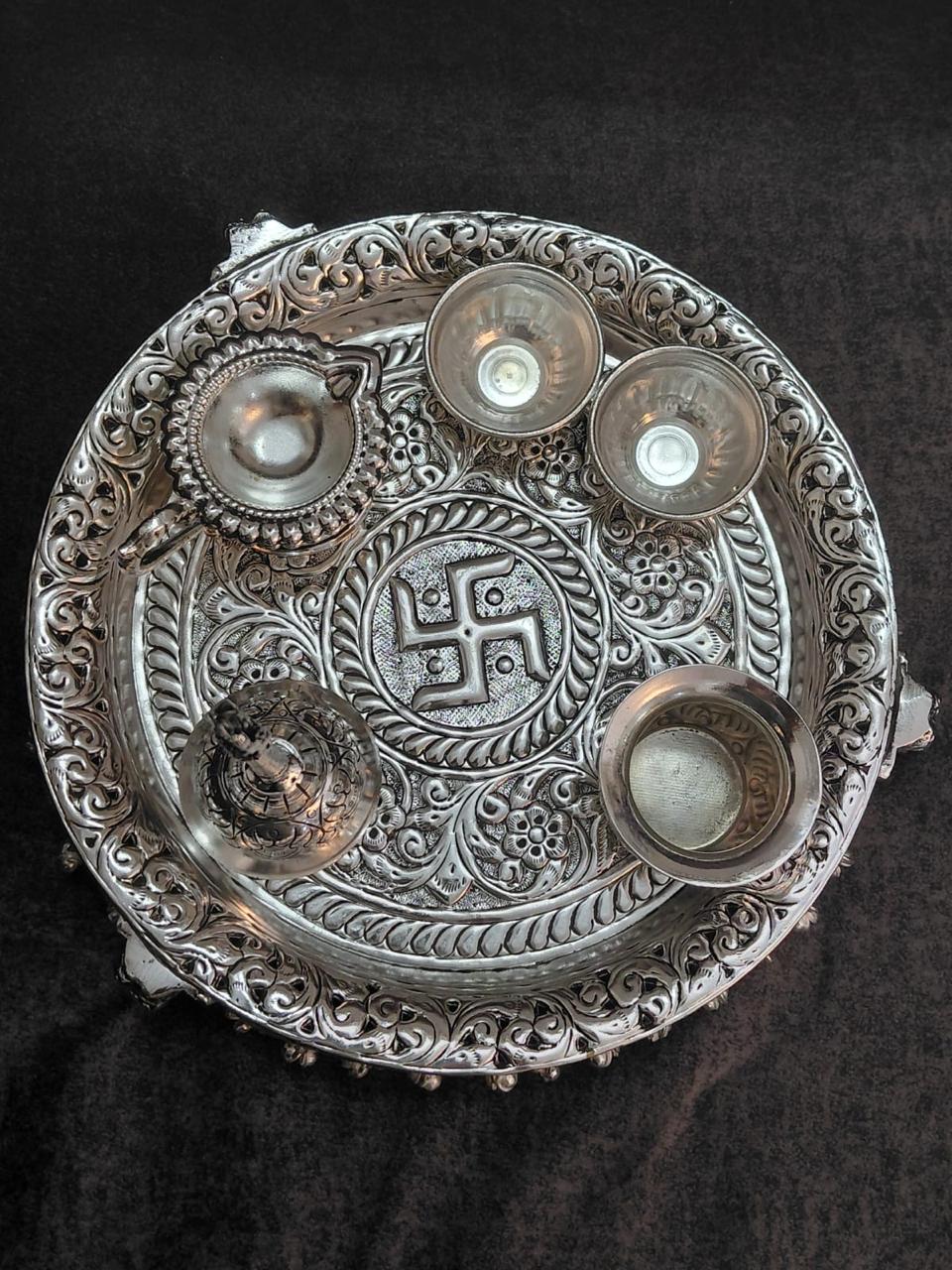 Bring home divine elegance with this Handcrafted Brass Silver Pooja Thali Set, a perfect blend of tradition, artistry, and functionality. Designed with intricate detailing, this puja thali set is crafted from premium quality brass with silver finish, making it a timeless addition to your prayer rituals.