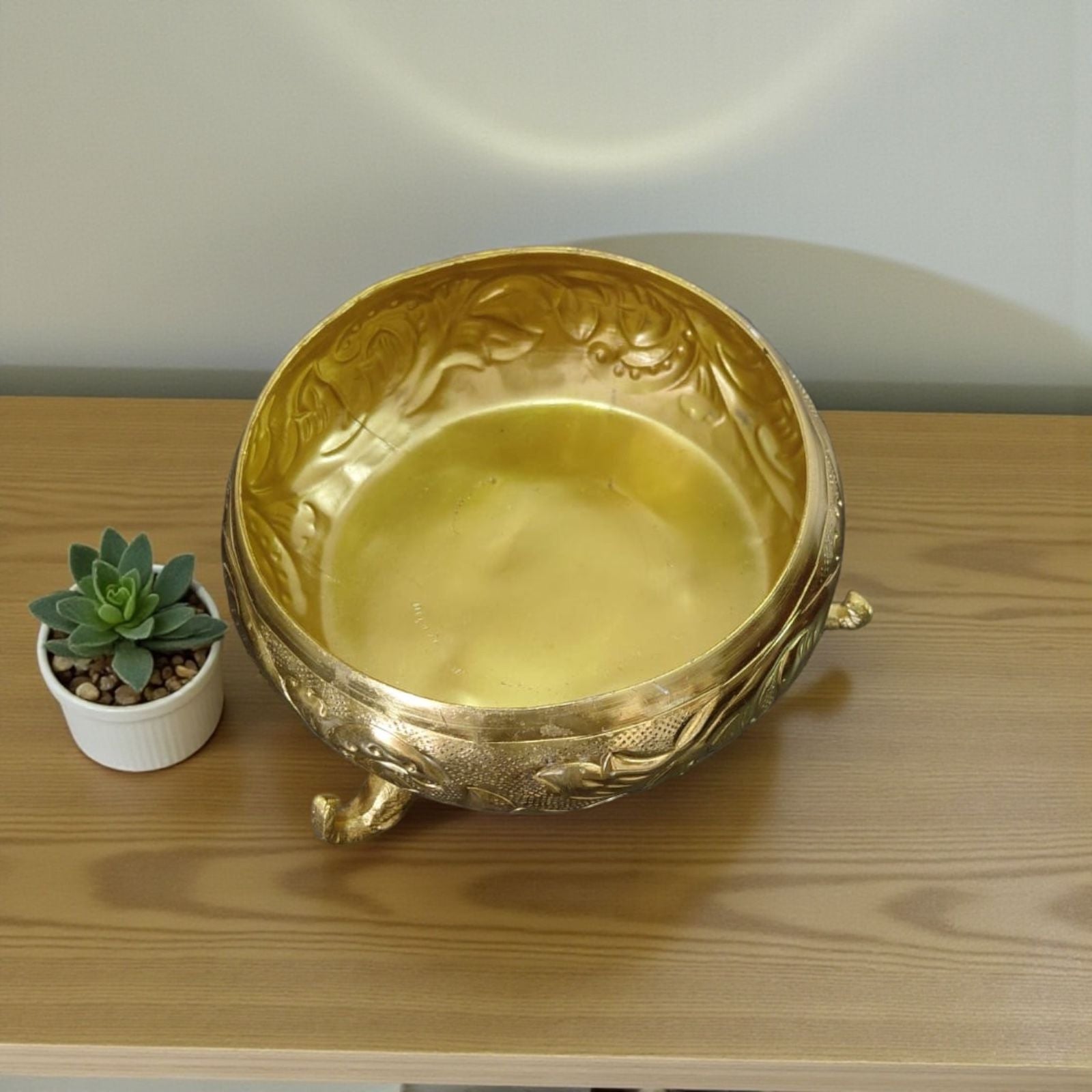 Bring home a symbol of prosperity and elegance with this Elephant Stand Urli in Gold Finish. Designed with intricate detailing and a luxurious shine, this decorative bowl is perfect for festive décor, pooja setups, and elegant home styling.
