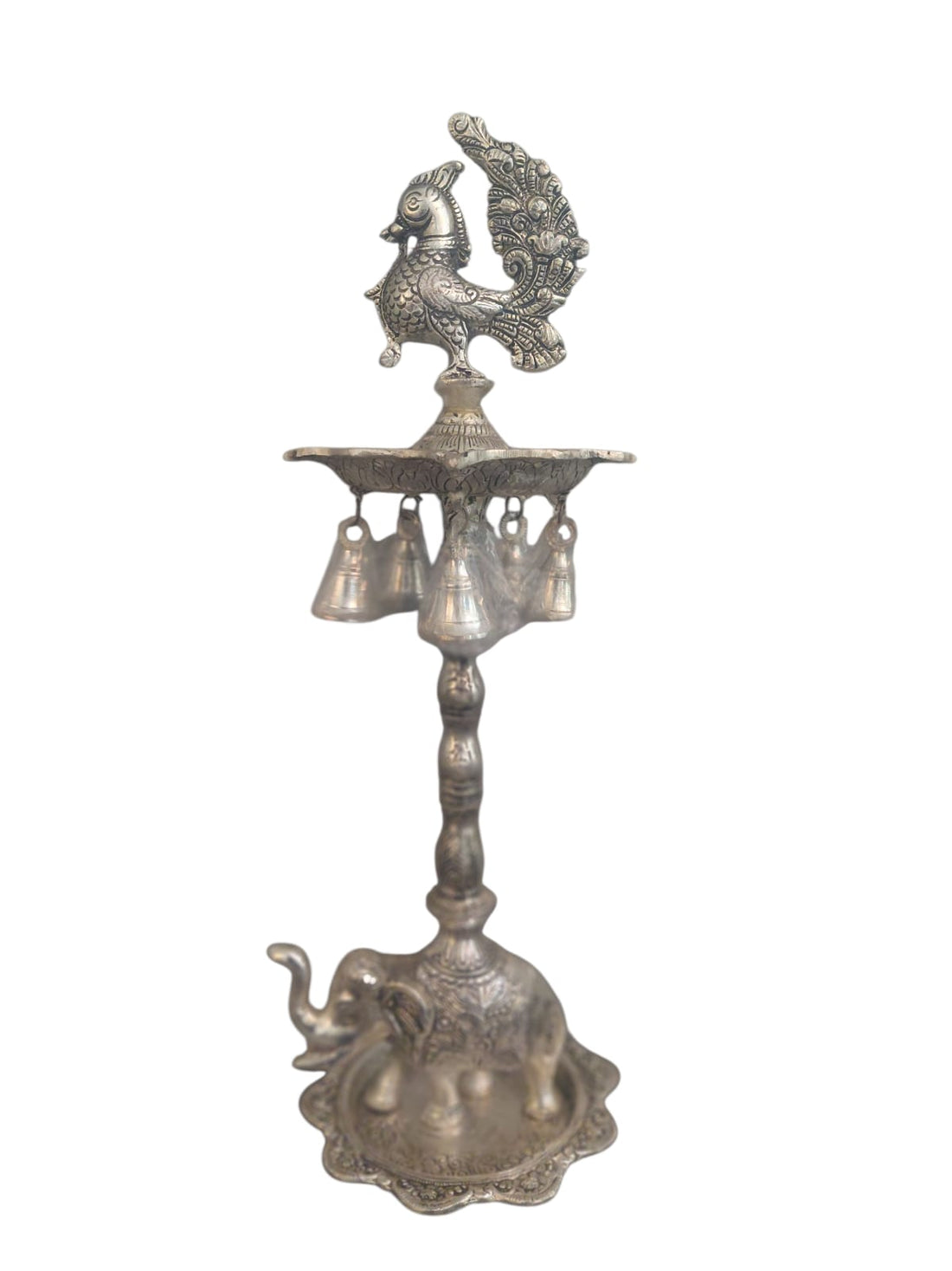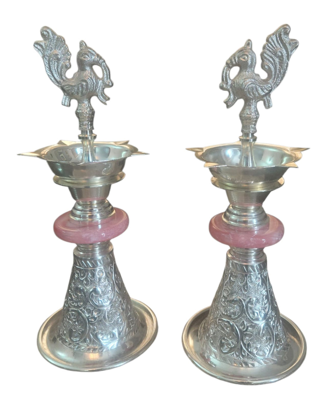 Brass Silver-Plated Samai Peacock Lamp with Rose Stone Elevate your festive rituals and home dรฉcor...
